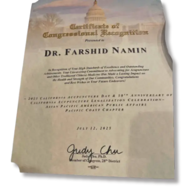 On Saturday, July 13, 2025, Dr. Namin was one of only 13 practitioners in California to receive a Certificate of Congressional Recognition in honor of the 50th anniversary of the legalization of acupuncture in the state of California.